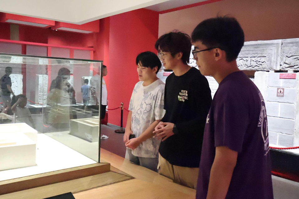 8月17日,实践团走进临沂市博物馆与科技馆,积极探索文脉传承的跨界可能。在博物馆,实践团驻足观赏“龙山文化蛋壳陶”“汉代画像石”等文物,听取其制作工艺的详细讲解,此外还通过手机扫描即观看文物制作工艺的全息演示。科技馆之行则启发了团队对“文明+科技”的深度思考,实践团成员们结合科技馆的互动展项设计理念,在参观中体悟科技推动文明发展的历程,感悟出科技与文化的融合将为传统文化传承开辟一条崭新的道路。