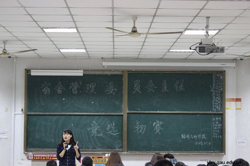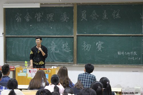 随着学校对学生宿舍实行分年级居住的规划的实施,为加强学院的宿舍管理水平,推进学院宿舍区的文化建设程度,提高园林学子的民主自治意识,10月11日,园林与林学院宿舍管理委员会主任竞选初赛在教学区举行。此次竞选,由学院学生会主席李增金、学院社联主席徐延鑫、学院相关部门部长担任评审,面向学院全体14、15级学生。