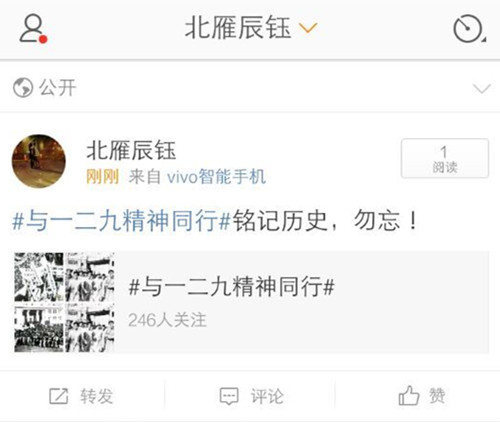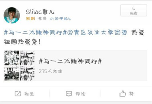 80年前的今天,在党的领导下,北平大学生怒冲街头举行声势浩大的游行示威,掀起了全国抗日救亡的新高潮。为纪念“一二·九”运动80周年,感悟中华儿女自强不息的斗志,园林与林学院全体学生代表在此期间参与了“#与一二九精神同行#”微博话题互动,在以“缅怀一二九,共抒爱国情”为主题的活动中荣获“阳光跳大绳”比赛亚军,引领学院全体学子铭记历史。