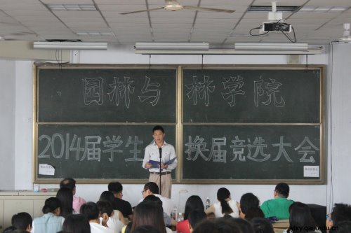 8月24日,园林与林学院2014届学生会换届竞选大会在教学区B402隆重举行。学院分团委书记李超、辅导员马双、学生会各部部长参加并担任评委。