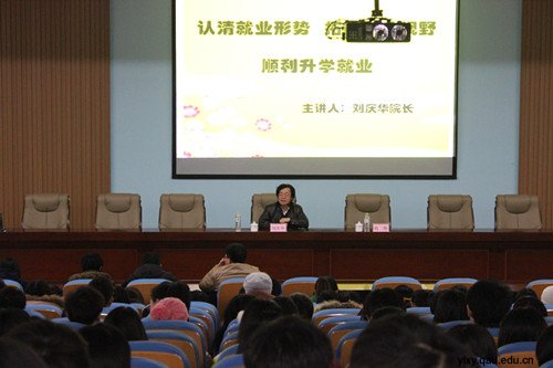 在报告会中,刘庆华首先为大四毕业生讲解了我院各专业毕业生面临的就业形势,对毕业生就业提出了明确的就业建议。他指出,毕业生要认清就业形势,拓宽就业视野,积累专业知识,勤学勤问,以期在升学或就业中占据优势。随后,针对大三同学选择就业还是考研的问题,刘庆华针对性地进行了解答。他表示,一般来说学历越高,就业相对容易,待遇也越高,希望有想法的同学继续深造,为铺就成功之路打好坚实基础。但考研或就业最终还要根据自身情况,不能盲目从众,一旦选择,就要毫不动摇积极准备,不能半途而废。最后,与会同学进行了积极提问,刘庆华耐心地予以一一解答。