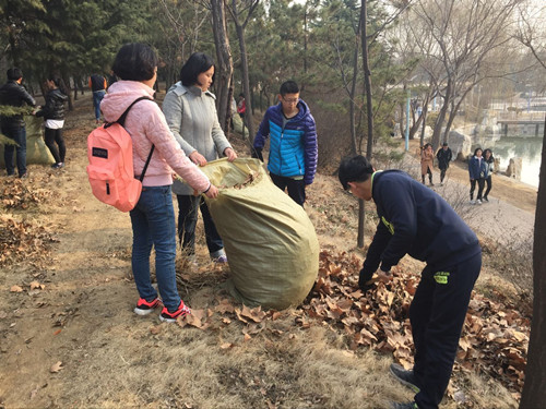 清晨,寒风瑟瑟,园林1501班全体同学准时来到学校的假山集合,准备对环湖假山进行落叶和垃圾清理,同学们有秩序地分成了多个小组,在活动小组组长为大家布置好工作任务后,同学们便迅速投入活动中来。有的同学用手往自带的塑料袋里捡拾路边和草丛里的垃圾,有的同学用扫帚细心地将落叶扫到一起。天气虽然寒冷,大家的双手虽然冻得通红,可没有人嫌脏,没有人说累,大家干得热火朝天,经过大家两个小时的辛勤劳动,假山恢复了干净整洁的面貌。
