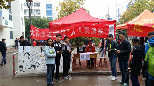 11月7日,园林与林学院人人表演社在东苑三号楼下举行“人人表演家”宣传报名活动,人人表演社部分成员向全校学生宣扬该活动。