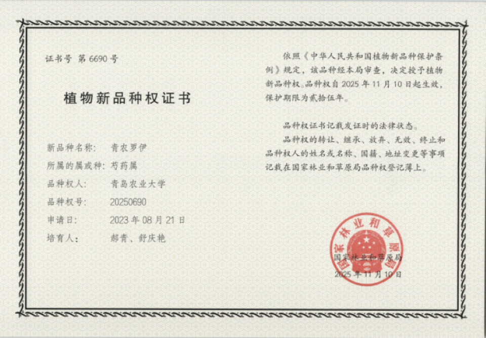 近日,园林与林学院牡丹种质创新与利用团队再添新成果,自主培育的牡丹新品种‘青农罗伊’获批国家林业和草原局颁发的植物新品种权。此前,团队于2024年底已有‘紫梦秋华’、‘蓝粉佳丽’和‘一线牵’三个新品种成功获批。此外,团队还积极参与合作育种,与中国科学院植物研究所联合申报的‘丝路花羽’、‘赤诚之心’、‘紫色魅力’、‘国植红曼’和‘国植玉兔’等5个新品种也已于近日同时成功获批,其中团队成员担任第二培育人。