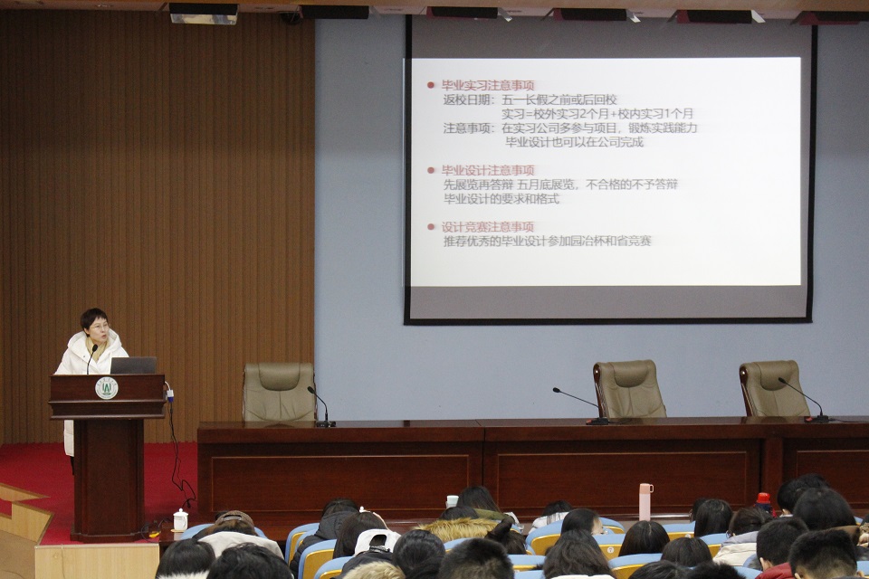会上,周春玲首先就开展好2019届毕业生实习工作作了动员讲话。她指出,毕业实习是学生对所学知识进行检验,并积累初步工作经验的重要环节,希望同学们能够以积极认真的态度参加实习。另外,希望同学们在考研结果出来之前多提升自己,为以后的就业奠定良好的基础。吕国莹为同学们分析了今年应届毕业生的就业形势,在待就业毕业生规模不断扩大,我国经济增速逐渐放缓的当下,就业难的状况是确实存在,同学们可能对于找到心仪的工作信心不足,但更应该看到职业的多元化发展,就业岗位和就业平台其实并不少。她鼓励同学们充分做好就业准备,拓宽就业渠道,自信果敢、积极就业,并对相关就业政策进行了详细介绍和解读。另一方面吕国莹告诫大家要珍惜在校实习机会,学习总结工作经验,为将来的就业提前做好准备。紧接着,各专业负责人分别为毕业生讲解了毕业论文和毕业设计具体要求。会上,孙贝贝还为大家梳理了就业材料上交的相关要求。