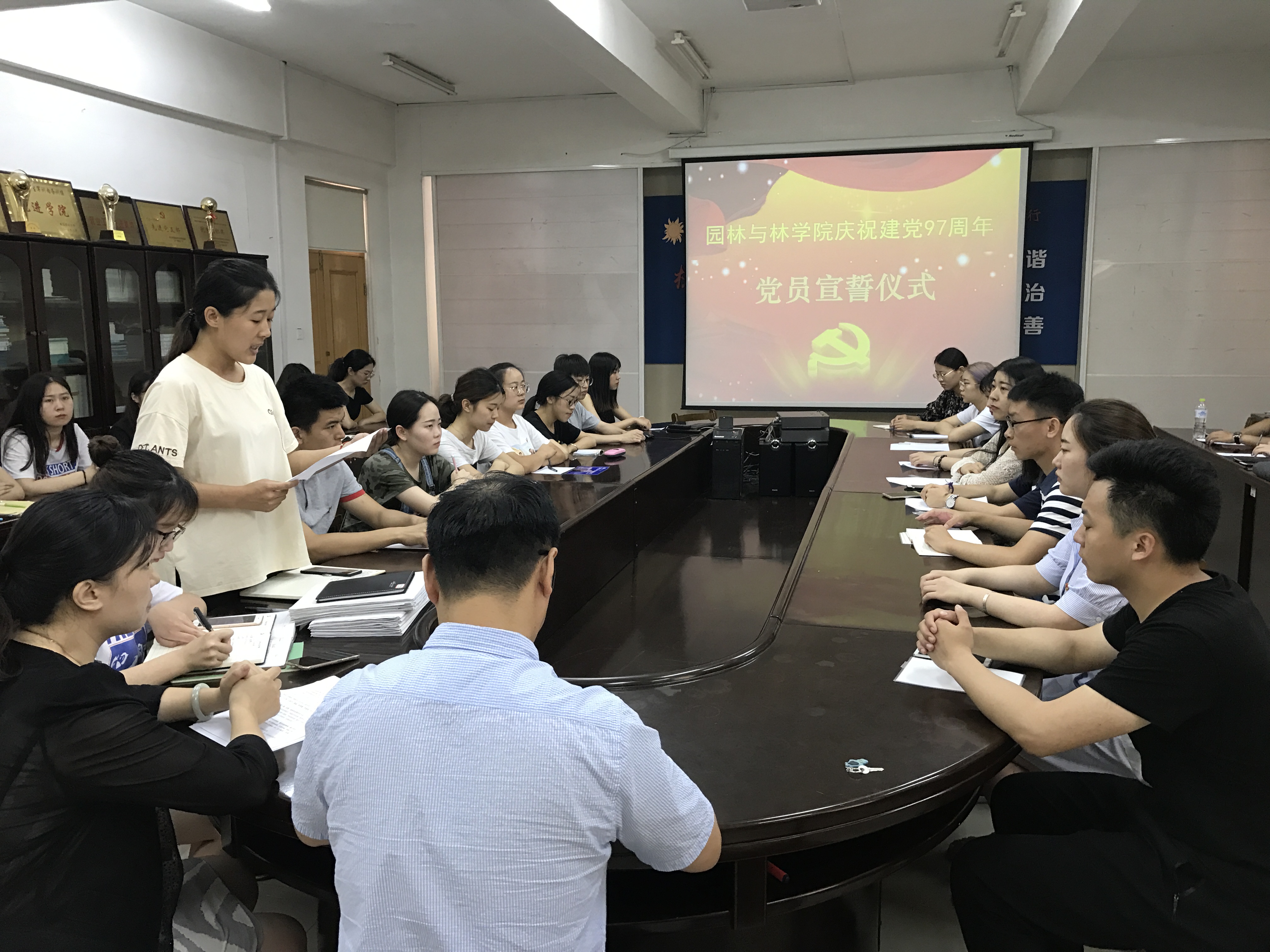 6月29日,园林与林学院在文经楼会议室举行了庆祝建党97周年党员宣誓仪式暨微党课展示活动。园林与林学院第三党支部书记费廷坤、第四党支部书记孙贝贝、第四党支部组织委员马双以及全体学生党员参加了仪式。