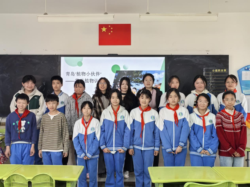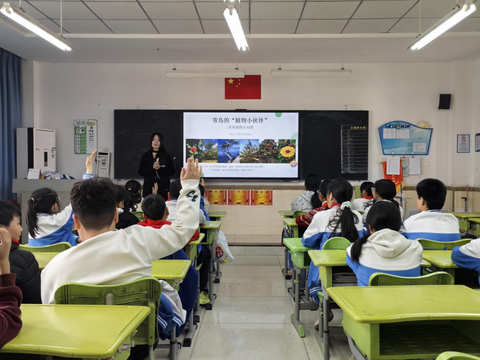 课堂上,实践团成员结合青岛暖温带植物资源特色,用通俗语言讲解雪松、耐冬等本土植物的形态、习性及文化内涵,穿插趣味问答、植物辨识等互动环节,让孩子们在轻松氛围中认识自然、热爱家乡。此次课程既丰富了靖城小学科普类场馆课程内涵,培养了学生创新探索能力,也让学生在实践中锤炼本领、厚植社会责任感,实现“教学相长、双向赋能”。