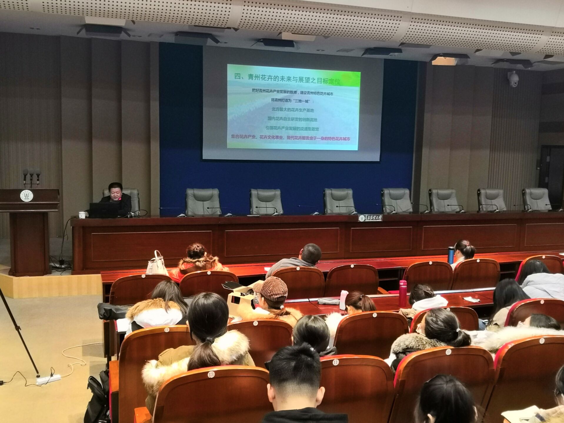 12月7日,青岛农业大学园林与林学院于学术会馆第一报告厅举行《青州花卉产业现状分析》报告会。报告邀请到青州市花卉高科技博览园生产处副主任李青春主讲,园林学院大三及大四部分学生参加报告会。