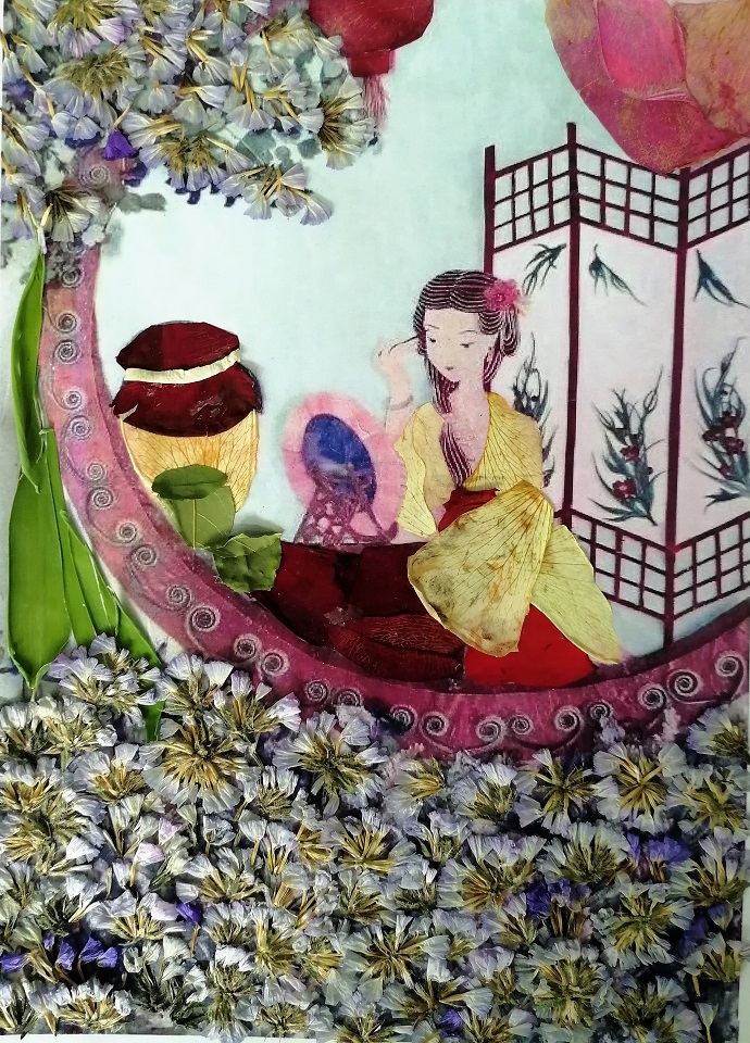 此次压花比赛选手共分为二十二组,要求在赛前设计好此次压花比赛的设计稿,并在比赛当天在规定的一小时内完成作品的拼合及粘贴。比赛一开始,大家就热火朝天的准备自己的作品了,在一个个小组中,大家分工有序,有的负责摘取挑选花瓣,有的负责在纸面上勾勒出作品的基本形。其间,还不乏听到参赛同学们的小声商议,提出对于设计理念的改进。最终在比赛结束时,大家都交上了一份令自己满意的作品。