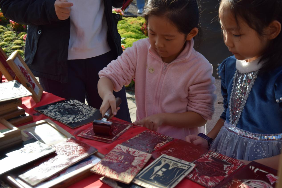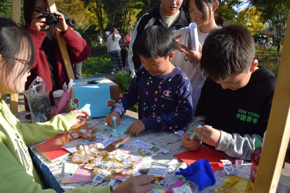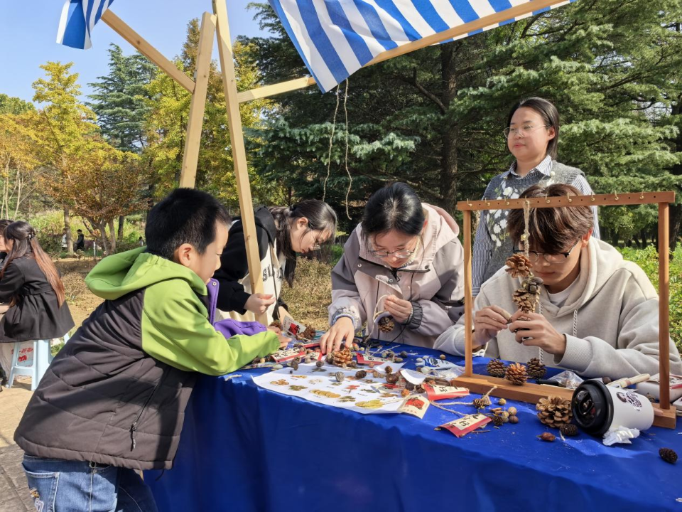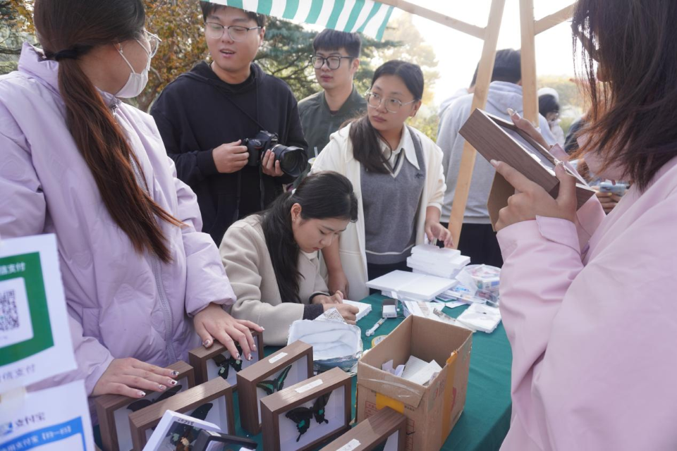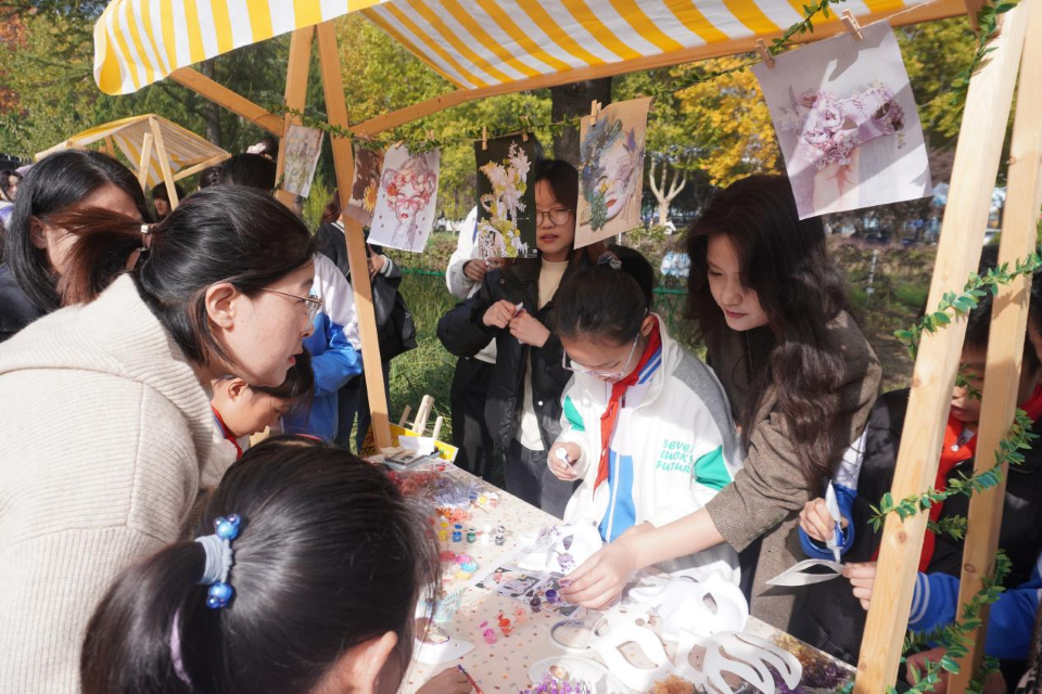 “丹枫悦赏・迎秋”板块以秋日自然景观为基底,融合园林、艺术、农学等学科特色,打造沉浸式自然体验空间。秋叶创作区前人头攒动,学生们手持画笔在枫叶上勾勒秋菊、银杏,或用梧桐叶、桂花枝在帆布包上完成植物拓印;昆虫展览区则通过标本展示、知识问答等形式,让参与者了解农业害虫防治知识,现场制作简易昆虫标本的互动环节,吸引了靖城小学的孩子们围坐体验。