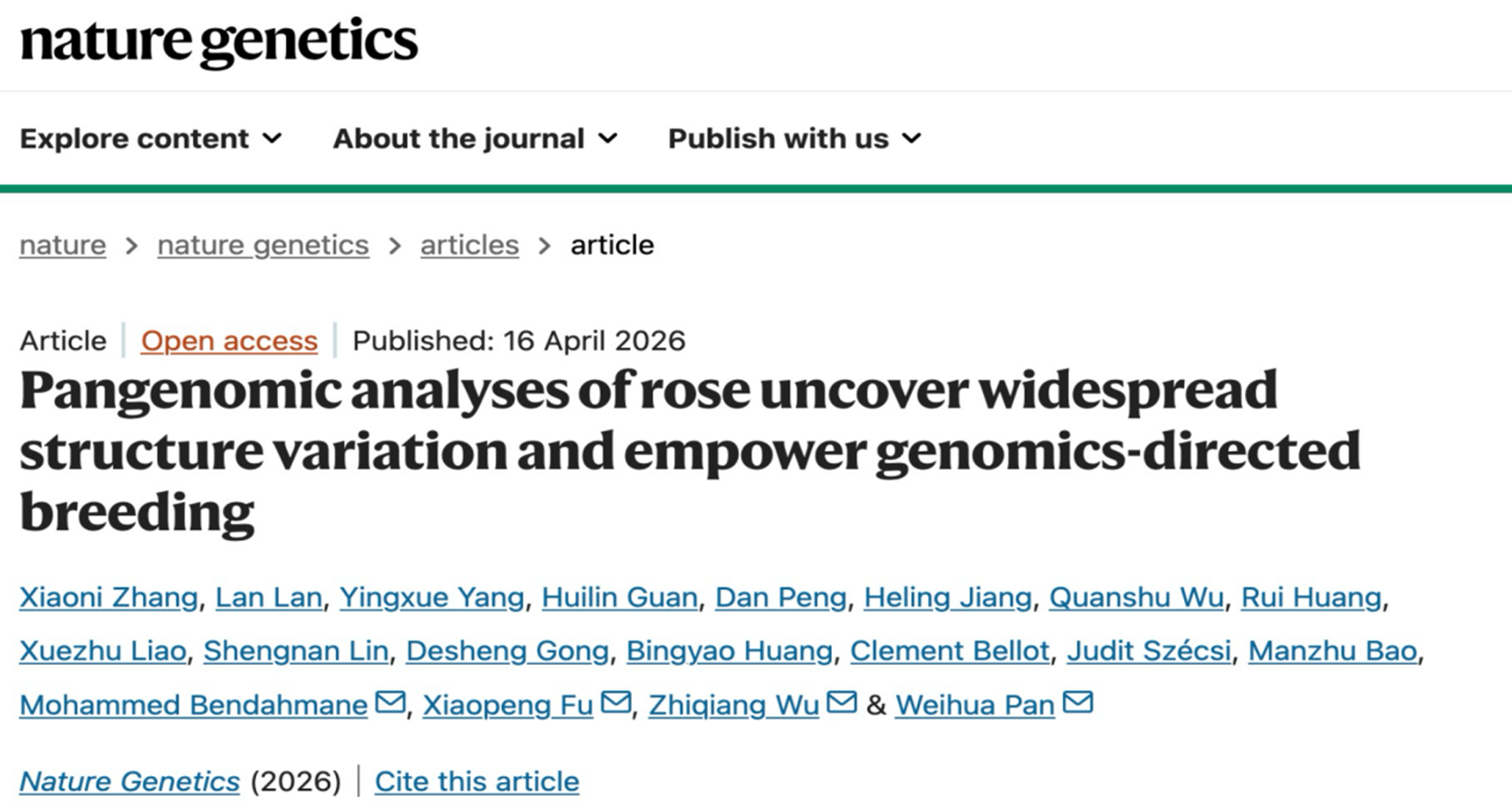 2026年4月16日,青岛农业大学园林与林学院青年教师张晓妮以第一作者身份在国际顶尖期刊《Nature Genetics》上在线发表了题为“Pangenomic analyses of rose uncover widespread structure variation and empower genomics-directed breeding”的研究论文。该研究成功构建了全球首个单倍型解析的月季泛基因组图谱,系统解析了蔷薇亚属的遗传多样性。这一成果有望推动月季育种从传统经验模式向精准设计跨越,助力开启月季“第二次育种革命”。