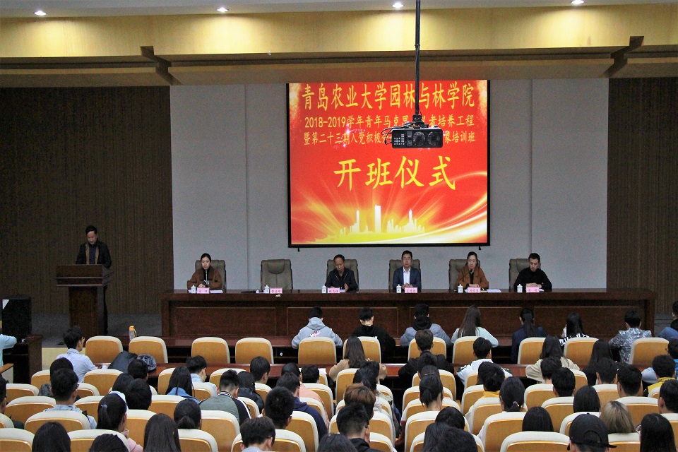 10月29日,青岛农业大学园林与林学院2018-2019学年青年马克思主义者培养工程开班仪式暨第二十三期入党积极分子、发展对象培训班开班仪式在学术会馆第二报告厅顺利举行。园林与林学院党总支书记林志强,校团委副书记王光炬,学院党总支副书记费廷坤,辅导员孙贝贝、马双、梁超出席会议。会议由孙贝贝主持,学院全体学生干部以及第二十三期入党积极分子、党员发展对象参加。